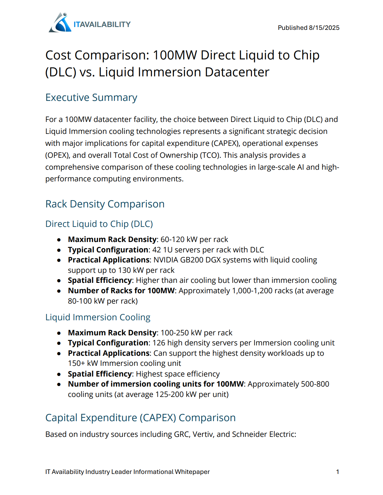 For a 100MW datacenter facility, the choice between Direct Liquid to Chip (DLC) and Liquid Immersion cooling technologies represents a significant strategic decision with major implications for capital expenditure (CAPEX), operational expenses (OPEX), and overall Total Cost of Ownership (TCO). This analysis provides a comprehensive comparison of these cooling technologies in large-scale AI and high performance computing environments.
